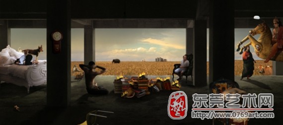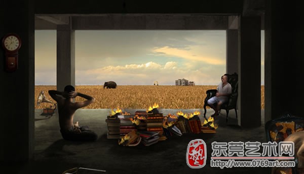 是的,在《老剧院中熟悉的音乐(Familiar Music from the Old Theatre)》这类数码拼贴作品中,你可以看到意象之间的不和谐。主题是焚书,但在主题之中,有对正侵入我们的风景的所有国际范儿的揶揄,比如如今在我们的市场中大量生产的法国范儿,与一件印度寺庙装置比邻,整个作品好像处于一座尚未完工的建筑物中,这像极了印度当下的风景。建筑物鳞次栉比,但没有一座是完工的。这件作品很棒,对色彩的运用也很严谨。