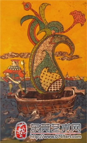 所以如《佩兹利(Paisley)》这类作品便全以这类手工颜料绘制,仿佛出自1850年以前的技艺。非常漂亮。画中有一个红桃J在一艘(类似)中国帆船上航行,上有佩兹利图案船帆。而接下来你会看到船帆上装饰着战斗机的图案,船上还生出一枝罂粟,有如推动帆船航行的烟囱。其中的象征不言而喻:红桃J代表英国人,毒品当然会导致战争,不仅在19世纪如此,今天亦然。这很有趣,在这样一件作品中,你可以看到印度和中国的历史如何相互交织,却常常未被认识。这种作品深入人心,模糊了高雅艺术与工艺美术、艺术创作与手工艺之间的界限,在印度当代艺术实践中是非常值得注意的。