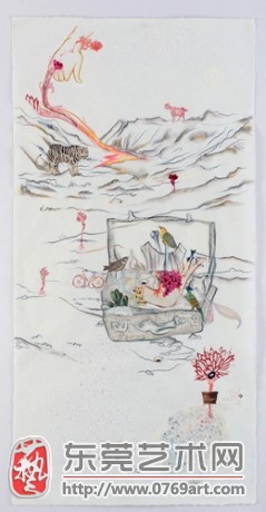 所以你在密苏的作品中能看到许多波斯和中国绘画中的手法(远山,卷轴的形式),而其中的细节是特殊的、历史性的,并具有讽刺性。茶由中国传入印度,鸦片由印度传入中国。如此,她还画了许多别的中国进口货——中国自行车,蒙古马。像她这一代(40岁左右)的所有人一样,她的方法极具讽刺性。