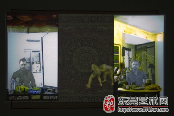 卡勒卡自21世纪初一直在创作一种将绘画与录像相结合的作品。他曾是一位非常成功的画家,但转而在绘画和录像之间搭建这样一座桥梁,这样一种媒介,我没见过与之相似的。你能得到这样的品质,或许可称作印度品质,在他的作品中不存在终止,这是一种印度艺术家(以及作家)们拥有的“环状想象”。他的作品便是关于这种“环状想象”,在世俗世界之下,心智的交汇涌动不息,仿佛思想之河。所以,你看这幅画,一个男人静静地坐在生活情境中,然后,你突然看到移动的影像使他的思想运动起来。卡勒卡的作品真的很丰富。有各种层面。美学层面是即时的,然后,还有其他的层面,如果你愿意停下来观看,它们会向你展开。
