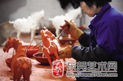 3月30日,洛阳南石山村一家文物复制品工厂内,工作人员在给“马”上釉彩。A10-11版摄影/山石
