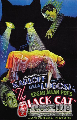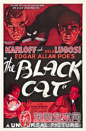 1934年拍摄的美国恐怖片《黑猫》(The Black Cat)由鲍里斯·卡洛夫主演,根据爱伦·坡的侦探小说改编。这部影片的D款单张海报在2007年卖出28.68万美元。看看这些猫咪的眼睛!