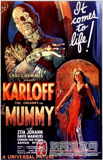 美国演员鲍里斯·卡洛夫可以说是最昂贵海报竞赛中的冠军人物,在前十名中由其出演的影片占据了一半。这张电影海报出自其主演的1932年美国电影《木乃伊》(The Mummy)。1997年,这一海报以43.55万美元成交。