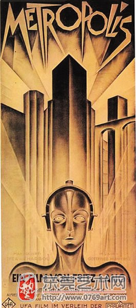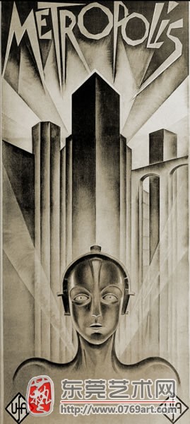 德国电影《大都会》(Metropolis)的海报有“史上最美电影海报”之称。这一海报由德国平面艺术家Heinz Schulz-Neudamm设计,以“艺术装饰主义”(Art Deco)手法切合甚至提升了影片主题。这种艺术与宣传效果兼具的电影海报,是重要的艺术收藏品。和德国宣传版相比,这款国际版显得更加干净简洁,德文说明部分被取消,更能体现设计者在极简空间中用机械线条及冷淡色彩制造未来世界的感觉。