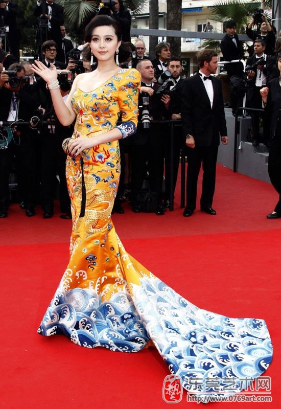 在2010年的第63届戛纳电影节上,范冰冰身着这件龙袍走开幕红毯并惊艳全场。范冰冰工作室的宣传人员赵萌向记者证实了此事,她表示,范冰冰所穿的原件已被杜莎夫人蜡像馆收藏,这件被阿尔伯特博物馆永久收藏的龙袍是“升级版”,“据说更精致,上面绣的龙都是浮雕版的。”