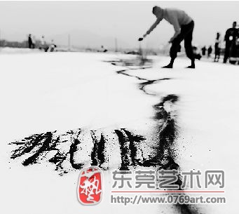 蔡国强正在西湖的大平台上用火药写生。