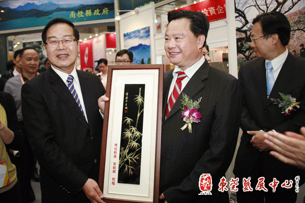 台湾省南投县展馆向广东省委常委、统战部部长周镇宏(右)赠送纪念品(摄影/记者 周明锋)