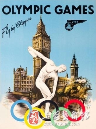 另一幅珍贵的作品是1948年沃尔特-赫兹为泛美航空所做的宣传海报,号召人们夏天去伦敦观看奥运会。这张海报背后有着丰富的历史故事。在1939年,伦敦得到举办第14届奥林匹克运动会的机会(原定于1944年举行),但之后由于二战,运动会被取消。二战结束之后,伦敦再次被选中,成为1948年的奥运会东道国,尽管当时的英国还远未从战争的创伤和战后经济的萧条中完全恢复。赫兹的设计将远古奥运的象征、一座古希腊雕塑和现代奥运的象征五环结合在一起。
