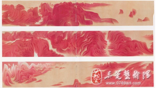《壤歌》来自于上古民谣《击壤歌》,所谓“日出而作,日入而息。凿井而饮,耕田而食。帝力于我何有哉?”描绘的是在上古尧时代的生活,这与卢辅圣作品中的高古意境一脉相承,整个画面均为红色山脉,连绵起伏,乍看苍茫、洪荒,然而却又空灵缥缈。