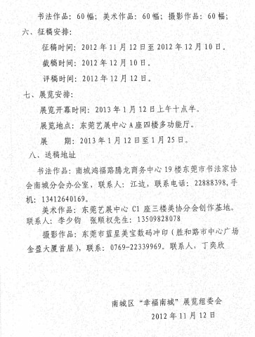 书法作品:南城鸿福路腾龙商务中心19楼东莞市书法家协会南城分会办公室,联系人:江边,联系电话:22888398,手机:13412640169