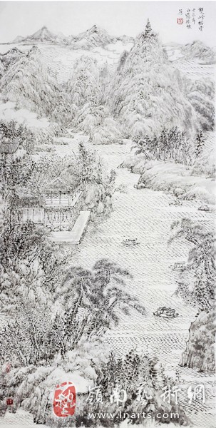此外,董振怀的山水画十分注重水墨情趣。他善于用水墨的浓淡揉和出远近层次井然的山;灵动透明的河流,静谧和谐的山村,气韵生动,意境悠远。他用水墨诠释着我国山水画的精神,宣泄着他对我国大美山川、古老村庄的感情。