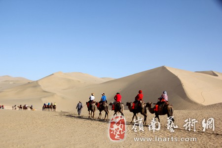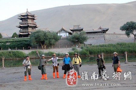 在结束敦煌莫高窟的朝圣采风后,众画家还前往鸣沙山、月牙泉风景区参观,众艺术家们乘骑沙漠之舟骆驼,驼队铃声悠扬,画家们感受千年前的古人往来于这“丝绸古道”的艰辛,和增进西域各国与中原文化交流的执着精神。沙峰起伏,人们顺坡滑落,便会发出轰鸣声,称为“沙岭晴鸣”。艺术家们在月牙泉畔拍摄日落,被那美丽的自然奇观随吸引,流连忘返,久久不能离开。