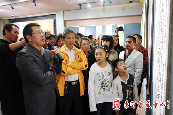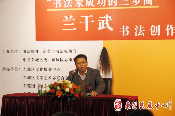 由书法报社、东莞市书法家协会、中共东城区委、东城区办事处主办,东城区文化服务中心、东城区文联、东城图书分馆、东莞市书法家协会东城分会承办的《书法报》走进东莞东城暨兰干武书法创作专题讲座于12月12日在东城展览馆举行。东莞市文联副主席、市书法家协会名誉主席岑诒立,市文联委员、市书法家协会副主席罗派钧,东城区文化服务中心主任、市音协主席、区文联常务副主席康健,和《书法报》执行主编、《中国书画印》主编、湖北省书画研究会副主席、作家、书法家兰干武,《书法报》编辑陈明华,《书法报》摄影记者欧阳媛,以及市书协会员、东城书协会员、东城书法爱好者共300多人参加了活动。