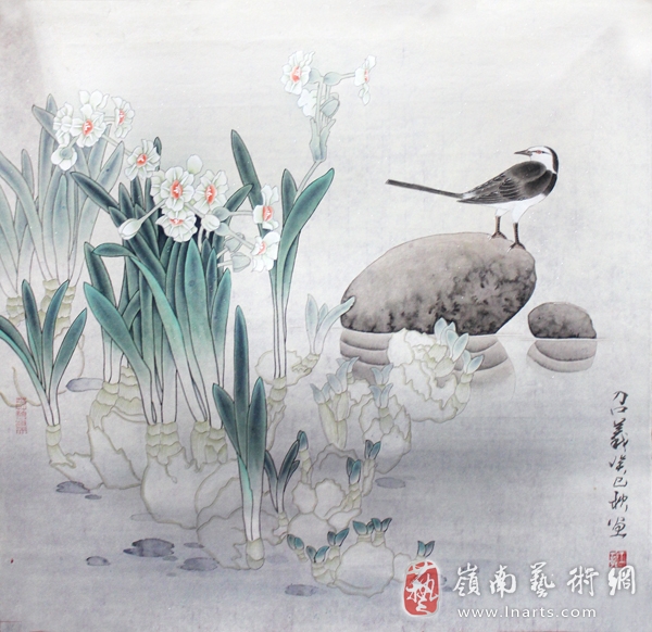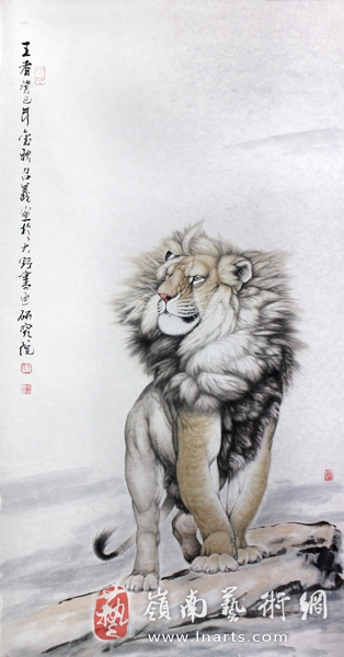 王召义善画花鸟,并常常将花鸟鱼虫放置于自然景物之中,使其与它们生活生长的环境融为一体,自然和谐、统一协调,表达了画家追求主观精神与审美情趣统一的愿望。如来他采风展出的这几幅作品,鹤与芦苇、湿地以及灰色的背景相统一;浅溪中的水仙与石上站立小憩的雀儿和谐统一;威猛上午雄狮与苍凉的天空相统一。
