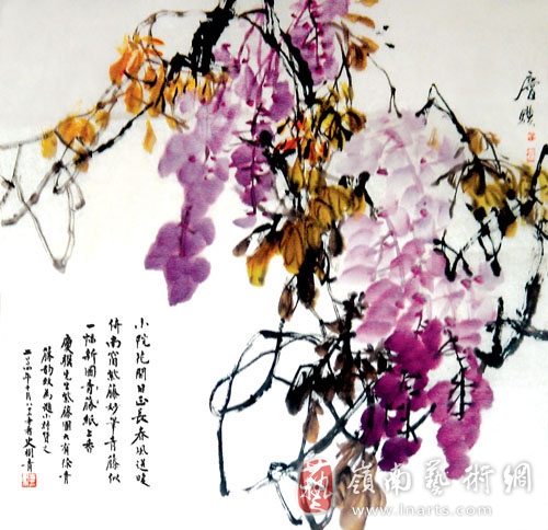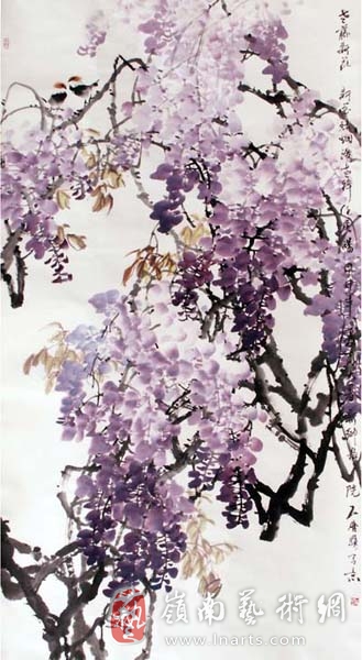 石庆骥是近年来画坛上颇受瞩目的花鸟画家,尤以画紫藤著称。他的画路很宽,亦兼写山水、人物。近十年来,他辛勤笔耕、上下求索、呕心沥血、惨淡经营着一块属于自己的艺术天地。石庆骥的传统笔墨深厚,他在对紫藤的探索和创作上,倾注了大量的心血,他笔下的紫藤力图有别于前人和今人。一是不画叶,使之更好地突出花的美,体现出那种恬淡,清雅与婀娜的姿态倩影;二是表现一种光与影,使画面清新剔透,层次井然且富有透视感;三是注重它的虬枝与盘根错节的干,体现出一种阳刚之美,使之与花的妩媚、柔和、馥郁、淡雅和枝干的厚重、雄浑、拙涩对立统一起来。