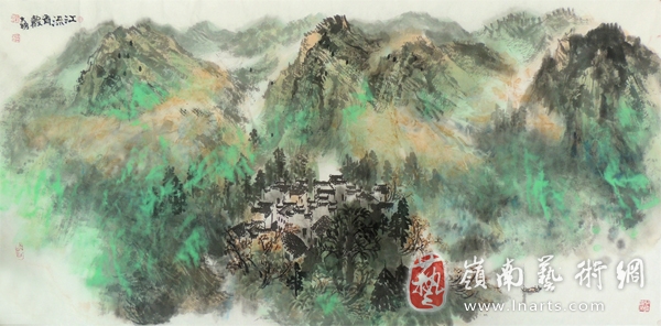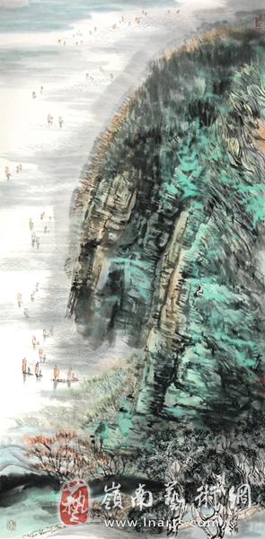 顾大明的青绿山水清新自然,其作品烟雨空濛生色,云水青山明媚,气象瑰丽磅礴,意境悠远绵长,完美的再现了阳春三月江南水乡山国的如梦幻境和俊美诗情,展示了顾大明在青绿山水艺术上不断探索的丰富成果和创作历程。画幅之中一草一木都充满了生机,包孕着灵趣感,且笔力刚劲,色彩丰富,实现了他对传统中国山水画审美价值的追求,朴素而自然,生动而完美地表达着现实生活的气息。