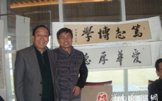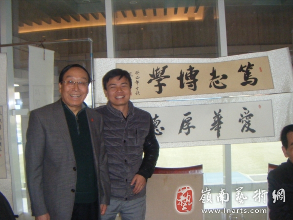 中国老龄事业发展基金会理事长、华英援助基金管理委员会主任、民政部原副部长李宝库与书法家钟文在钟文创作的主题书法作品《爱华厚德》前合影