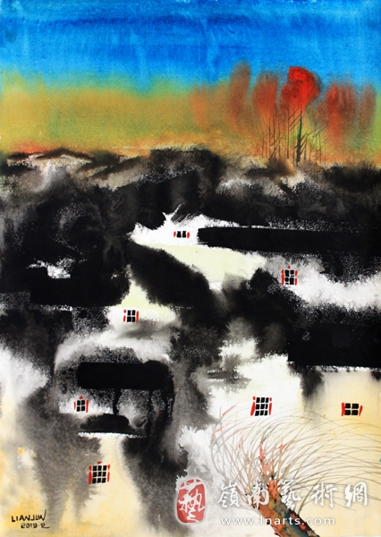 李安军的水彩画作品,在用彩和技法上都其独特的一面,色彩上融入了中国水墨画,水、墨相晕的方法别开生面,颇具“墨趣”;构图上又有版画构图的特点,色彩布局分明,颇具装饰性。其画面给观者带来的强烈冲击力和震撼感让人难以忘怀。这正如新华社安徽分社常务副总编、著名诗人陈先发先生对他的评价:诗意充溢的色彩运用,独具匠心的构图布局。徽州在他的笔下成为一组意象的符号。而中国画的笔墨语言又使得他的这个系列作品彰显出“鲜明的个性特色”,飘荡着古典的惆怅。