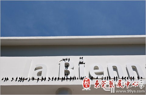 因此,在威尼斯双年展开幕的第一周,当超过2000只“鸽子”聚集到威尼斯时,人们不可能忽视这个现象——双年展的国家馆仿佛成为了这些“鸽子”的故乡。不过,它们仅仅只在Palace of Exhibitions(这里是以前的意大利国家馆)中央的建筑上被发现:它们或停在这幢建筑外壁的臂架上,或集合在椽子上,甚至还停留在建筑内部摇摇晃晃的各种管道上。这是意大利艺术家莫里吉奥-卡特兰(Maurizio Cattelan)特别为双年展中央馆创作的作品。在作品中,这些鸽子都按原尺寸大小被做成了动物标本。当被问及他是否会亲自捕捉这些鸽子时,他笑着否定了:“我是从当地一间剧场供应公司买到它们的。”