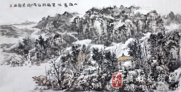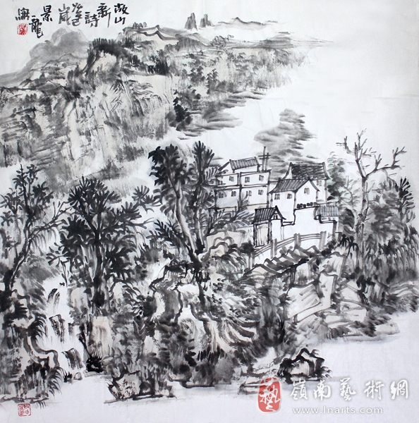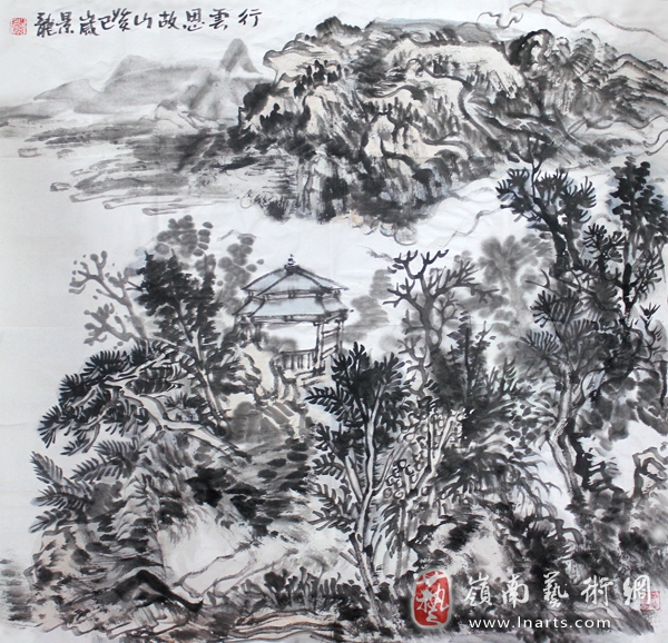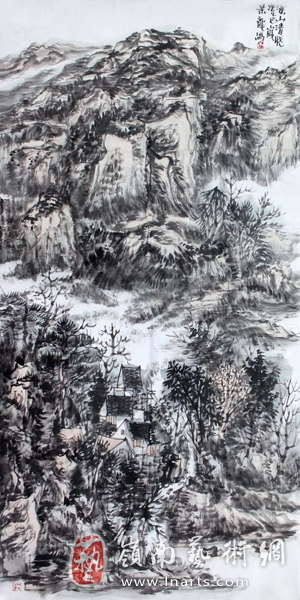 颜景龙的山水画结构严谨,景物蓊郁,有曲折生辣之趣,其笔墨苍茫浑厚,展现出一种山水画大美的雄风。他笔下的山水画笔意连贯、由一而终,无论是大幅巨帙,还是水墨小品,墨色都由浓至淡,由湿到苍,挥洒自如。颜景龙善用笔,亦善用墨,除浓淡相破外,干擦的用笔和淡墨濡染,无疑增补了笔墨的厚度,从而使得画面达到“苍茫浑厚”的效果。他的山水画创作,已经超越了想象思维能力与经验,升华为自己艺术主体的心理境界。这种经过情感投入的艺术形象,是他内心精神世界的真实反映。