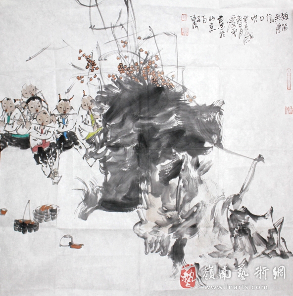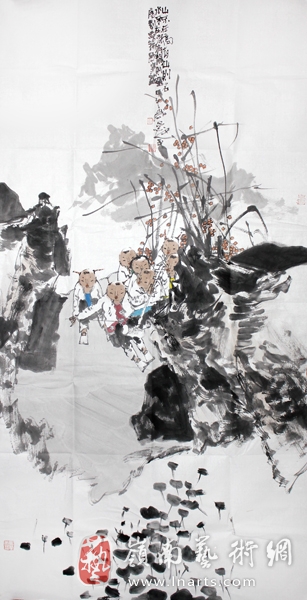 观郝爱平的人物画作,绘画语言是个性化的,画面重视色彩、构成和节奏的关系,蕴含着一种理性的思考,并且由于情绪的波动及不断地破、立,意趣横生。笔墨上运用鲜明的对比手法,细线条与浓墨块相对比之间更能显出画作的节奏与韵律感。从题材上来看,他善于借助于那些天真无邪的乡童,或三五成帮或几十成群在秋风摇曳的山林沟壑之间牧羊、拾柴、采撷或横笛、踏舞、嬉戏,充分展现了画家内心对自由、纯真、淡远的高境界的追求。同时画家在这种境界的追求中,也带给了读者人性真善美的触动。