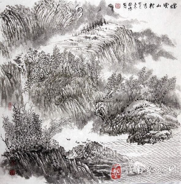 他的山水画以淡墨干皴刻画出古朴苍浑又繁复厚重的历史感觉以及记忆的深刻。他用淡墨营造出淡逸而悠远的视觉效果和审美环境,用饱含热情的画笔勾勒出山的层次与山水环绕的场景,再用山村古老的意象烘托出宁静朴素的境界,让我们感受到生命朴质无华的美。在创作中董振怀用水墨诠释着中国山水画的精神,宣泄着他对祖国大美山川、古老村庄的感情和深深的记忆。