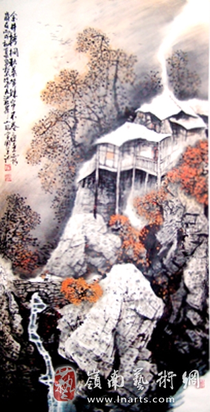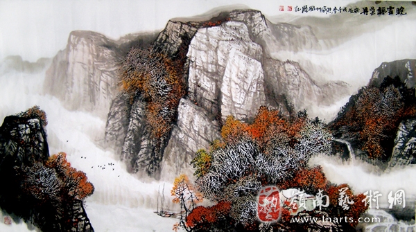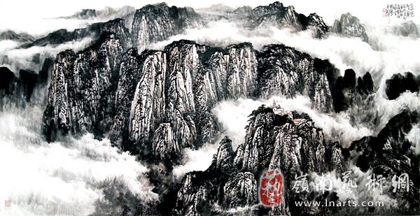 欣赏何国胜的画作,扎实的传统功力在构思、布白、笔墨、意境中寻而可见,不论是斧劈皴还是雨雪皴和没骨皴法均得心应手,对蜀地岩石山的纹理精雕细琢,努力追寻笔墨与大自然的鬼斧神工的趋同。但他不拘泥于古法,学习传统在与前人技法对话的同时,谦虚向自然求索,不论从布白还是意境都力求达到无我之境的和谐美。在色彩的搭配中,山石、云雾以墨色的浓淡区别,而树木着以光鲜之色,提升了整幅画作的神彩韵律。