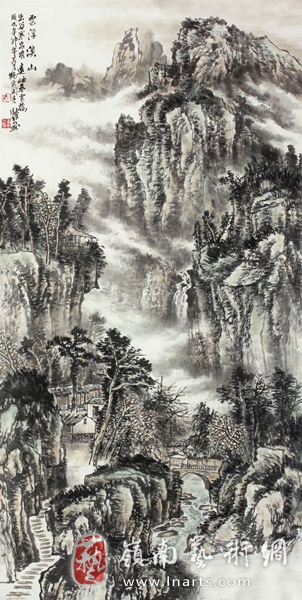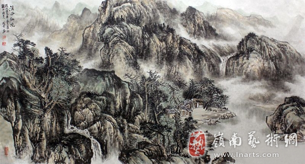 吉成方的山水画作品以气势恢宏,浑厚苍润,具有强烈视觉张力而著称。他笔下的山水,山势峻险,水流湍急,云雾若隐若现,渲染出一种空灵、深邃的艺术气氛。观其画,既有崭绝峰嵘之势,又有苍润烟曚之气,两者相辅相成,融为一体,十分和谐。从吉成方的作品中,不难看出他的基本功是相当扎实的。不论在构图上、用笔上,还是山水意境上,均颇见功力。