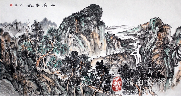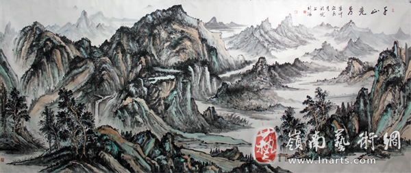 魏列军的山水有北方山水大开大合的气势,笔墨大气、粗犷、豪放。得其师范杨真传所授,画面皂白分明,山雄浑厚重,草舍、亭台、旅人隐约可见,山与人的关系和谐自然。山势混沌苍茫,隐约间显现画家的才学和对中国传统儒、释、道精神与山水自然的理解。