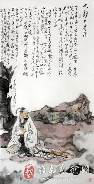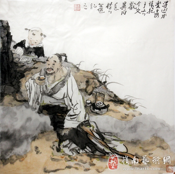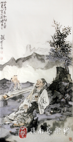 郭东健的人物画让欣赏者很容易沉醉其中,那些淡雅清新的诗词语句在他的笔墨下被描绘的酣畅淋漓,在他的画中总有一派温煦的气氛,还有一点抒情,一点诗的隽永,一点思古的余绪,一点淡然处之的诙谐,这是画家天赋本性的透射,我想若在古时候,他便是一位手沾墨香而气定神闲的雅士。我曾在兰州成功美术馆遇见许多喜欢郭东健的人物画的欣赏者,他们喜欢郭东健画中的清雅和轻松、自在的自然之态,仿似没有世间的一切束缚。