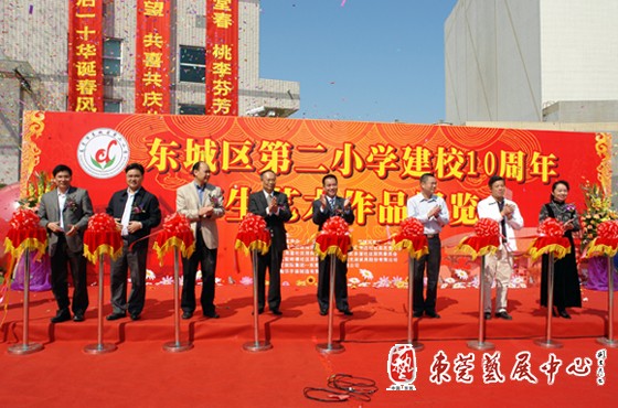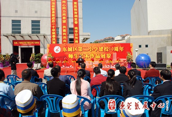 10月29日上午,东莞市东城区第二小学庆祝建校10周年师生艺术作品展览在东城二小和东城展览馆隆重举行,广东省人民政府督学顾问、省教育学会常务副会长刘劲予,东莞市教育局局长杨晓棠,东城区委书记、区人大联络委主任黄少文,区委副书记袁国超、区委委员、纪委书记潘健,区委委员吴沛林,市教育局基教科科长何炳基,市教育局教研室副主任谢洪涛,区宣传办副主任卢浩根,区文化服务中心主任康健,区教办常务副主任伦景润,区教办副主任李国平,东城二小校长杨冬青以及各界人士、相关镇街兄弟学校校长近200人出席了开幕式。