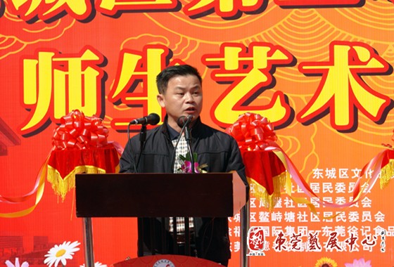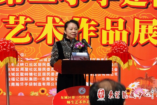开幕式上,东城二小校长杨冬青致辞,她表示学校建校十年来,在东城区委、区办事处的领导下,以素质教育为目标,确立尚美育人和育人尚美的理念,全体师生致力以艺术描绘着美好的人生。尽管所展出的学生作品还很稚嫩,但所散发的大胆、阳光气息给人以惊喜。东莞市教育局教研室副主任谢洪涛也发了言,他对东城二小的师生艺术作品折射出良好的素质教育成果表示赞赏,并希望东城各学校向他们学习。