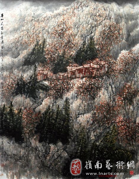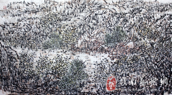 葛伟笔下的山水是寂静的、落寞的,更是清远的、不染纤尘的。他用历史的笔墨叙述着一方山水的几千年流变。茫茫群山环绕几乎占据人们的生存空间:干拆龟裂的土塬,沧桑变迁中遗留的沟壑,然而,就是在某个独立的塬上,依然有着生命的涌动,有着炊烟抱合青云的诗意呈现。在这样的作品面前,人们不能不感动于山民的那份来自于土地之下的岩溶般的活力;纷飞的豪雪,那枝柯横斜中隐隐的春意,那塬上人家的幸福温馨,都在雪中逗趣的人物身上尽显无遗,我们又可以看出画家的故土情怀是那么的炽烈。而画家用一种近乎撕裂的视觉语言,用一种呼啸而来的结构方式,凸显出画家内心的为过去的历史悸动,为现在的生活感恩。