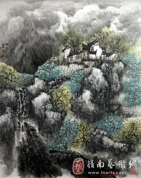 我们看葛伟的山水画,色彩鲜明,笔力浑厚,秦岭雄伟、野山苍茫。其作品具有强烈的西北风格和独特的东方意向思维,画风深沉雄浑、笔墨奇肆精绝,特别是他的《野山之构成》系列,是当今中国画坛巅峰领域的研究成果。如他的那一副《凤岭烟云》,整幅画作在画面上切割了地理地貌的物象,云山雾海中点缀以棱角分明的山石,把符号化的山水画笔墨程式和笔墨生发推向了极致,是对现代水墨与画理精湛解析后诠释的结构山水,表达了对自然的深刻体悟和独立的审美理念。带给欣赏者更多是一种浩瀚苍茫,震撼灵魂的自然之气。