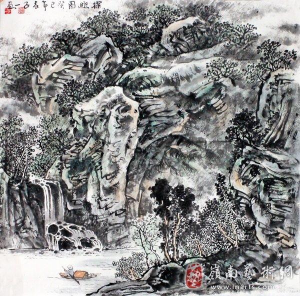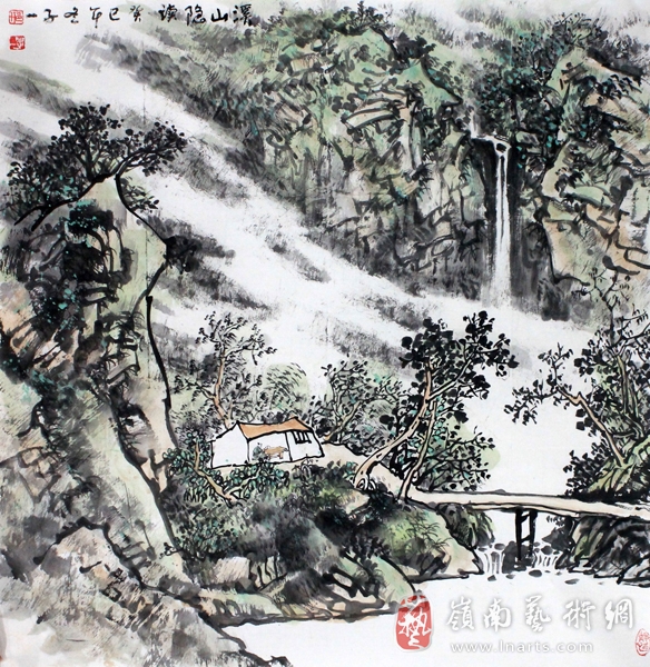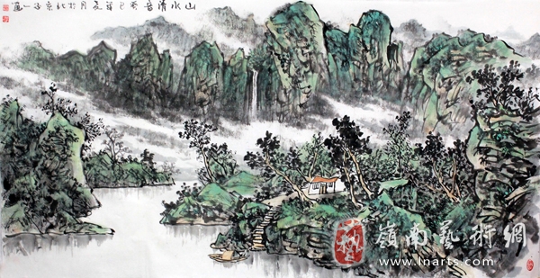 就以邢先生在成功美术馆展出的这几幅作品来说,《探幽图》《溪山隐读》以似拙实巧的线条,用画石之法累积成山,构成山石主体,辅以草木、舟船、房舍,而成点金之笔。《探幽图》以一驾舟者使舟进入如“桃花源”一般的世外之境为画面焦点,使画作主题得以全面升华;《溪山隐读》烟云笼罩,溪水、瀑布、小桥、山林隐士成为画面的最吸引观者的地方。《溪山幽居》《山水清音》山石的积累与上相同,但就画面章法布局而言又有不同。《山水清音》画面呈现一种开阔之境,山石奇峻,上覆以颜色,其湖面又平如铜镜,可见山之倒影,树木葱郁却又不遮挡烟云之妙、山石肌理。山峰的奇、云雾的流动与水的平静形成对比,画面呈现一种静中有动的清雅、奇绝的韵律感。《溪山幽居》则使得群山隐逸在繁茂的草木之中,画面以墨为主,溪水潺潺、幽居清雅,可引人入胜。