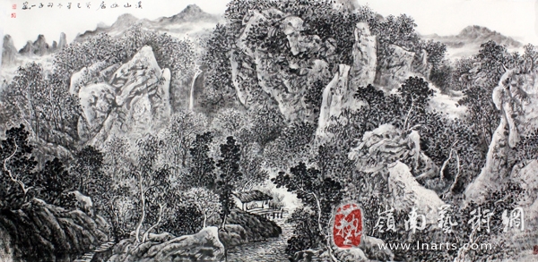 邢子一先生的山石皴法,用笔大拙似巧,融刘松年、李公麟、萧昭、倪瓒等人之法,似斧劈犹如折带还如鬼面,取古法山水诸家之精要,看似松散自由但其脉络章法可循,可谓脱胎换骨于“古法”,而又推陈出新,使其山水更具时代性格。画作虽多烟云浩渺、树木繁茂但毫不影响山体的脉络表现;以石磊山,石头的块面结构更加凸显,山水的肌理脉络得以强调,从而呈现出了一种山石奇险、脉络清晰,而又草木丰茂的画面效果。方法上的创新和突破也能见画家长期对中国山水画探究的成果,更能突显画家在中国山水长期研究中,对自然大道与笔墨之法融合的实践,是画家邢子一内心山水灵性境界的表达。