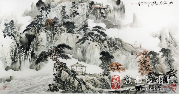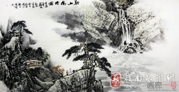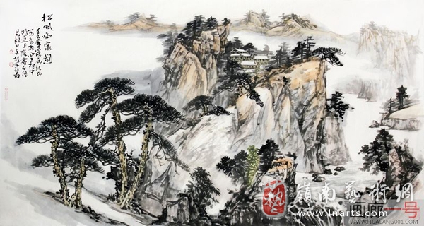 而在余新民的画作中,最为瞩目的当属松树占据着画面的显著位置,松树作为一种生命力的表现,历来就具有比拟的特征,具有丰富的人文意义,在山水画中以松作配景的,有近景取其枝、远景取其势,从而衍生出美意无穷的画境。如他的那一幅《松树临泉图》多以松树为点缀,像被赋予了勃勃生机,山蜂的险峰奇绝、溪流的蜿蜒涓涓,云雾的浑融飘渺,松树的葱郁苍劲,都幻化在了神美的意境之中。