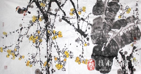 粱时民花鸟画作《一夜秋风满树金》