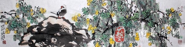 粱时民主席的花鸟画中体现着一种“道”的顿悟,这种“道”流溢与他的画作中,是传承自中国传统文化的自然之道、人生之理。观他的画,可见线条与墨色块面的互补,墨与色的互补从而呈现的和谐之美。画中花鸟多采用全景式的构图,全方位的呈现自然博大浩然之气象,其意义十分重要。
