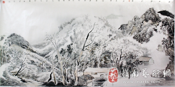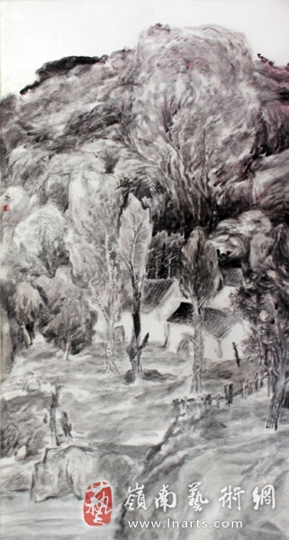 在田肃的山水画中,用笔讲究笔到气到,气到力到。无论是点还是线,都以中锋用笔为主,从而使“气”蓄于线条之内,用笔慢而从容,凝重而不板滞,往往有力透纸背之感。在他的画中山水、树石等艺术形象都是用有气势的笔墨塑造出来的,这种艺术形象因之才能够鲜活,才能具有无穷的生命力,因而,田肃的山水画才能结构出自己的独特空间,才能够阐发我们无尽的思虑。