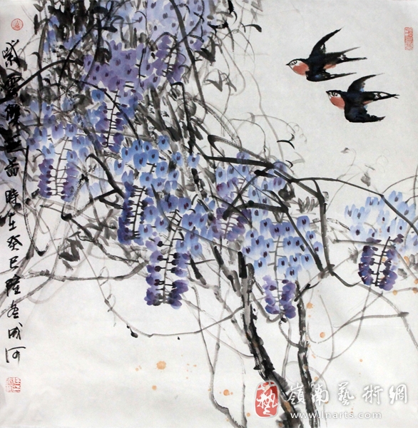 东晋画家顾恺之提出了“以形写神”“迁想妙得”的现实主义绘画理论,张彦远又说:“骨气形似,皆本于立意”,也就是说看一幅画“意境”是一幅画的灵魂。孙成河的画中意境是随笔墨自然而生,他以诗意的目光审视着花鸟世界,带着内心的某种情感笔意相融,倾注在笔端、宣纸之上。在兰州成功美术馆他的一幅四尺斗方《紫云双燕图》备受欣赏者注目。画中交错的紫藤繁茂的摇曳着枝腾,空中两只小巧的燕子轻盈追逐,画面以一种暗色调为色彩的铺成,顿时有一种苍凉的色彩笼罩着整个画面。《紫云双燕图》它给予观者的感觉不是题款的那种惬意,画面带给我们欣赏者的更多的是藤与鸟儿之间的呼应与对比。凌乱的藤萝与并进的燕子都被画家用略显夸张的线条表现的极具生命力,仿似每根枝条都在摇晃不停的动感中,每根羽毛都在风中被梳理,气势磅礴,富有诗韵和节奏。