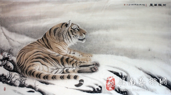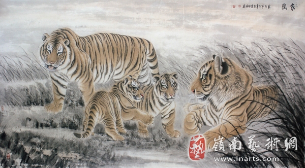 李奉海擅长画走兽,尤擅画虎,继承传统,博采众长,开创新意。虎在中国传统文化中的影响深远,画家选择画虎,旨在继承传统,力求在立足传统的同时,挖掘这个传统题材对于今天社会的新意义。观李奉海先生的诸多佳作,栩栩如生,威猛而不恶,具象而不俗,颇为难得。其以雄浑之笔墨、温润之色彩融于一体。尤其所作百虎图以场面恢宏之意境、博大雄阔之境界,千姿百态。