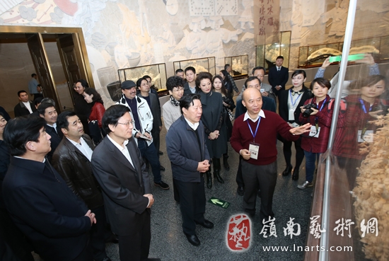 (左至右)广东省委常委、宣传部长庹震,广东省文联党组书记程扬,中国民协分党组书记罗杨,全国政协原副主席、中国文联主席孙家正,中国文联党组书记赵实,广东省委宣传部副部长顾作义等参观展览