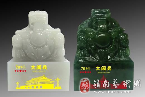 中俄大阅兵徽宝玺基正面分别雕刻天安门,莫斯科红场克林姆林宫及大阅兵字样,玺基背面分别雕刻纪念中国人民抗日战争胜利70周年以及俄罗斯纪念卫国战争胜利70周年暨世界反法西斯战争胜利70周年字样;玺基左上角雕刻黄色数字70及衔着橄榄枝的铁翅鸟图案。