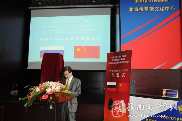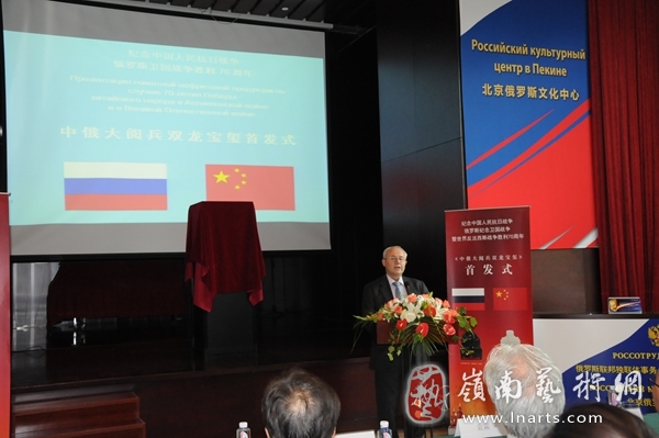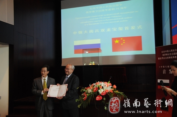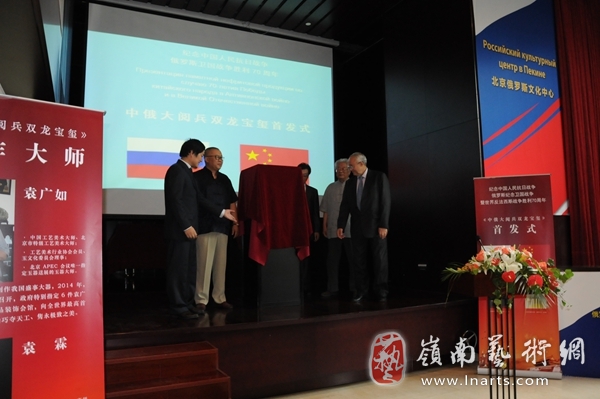 2015年7月21日,中国纪念抗日战争胜利70周年、俄罗斯纪念卫国战争胜利70周年、纪念世界反法西斯战争胜利70周年《中俄大阅兵双龙宝玺》首发暨赠予仪式在北京俄罗斯文化交流中心隆重举行。俄罗斯联邦大使馆参赞孔诺夫先生、中国工美集团副总经理王井春先生、《中俄大阅兵双龙宝玺》中国工艺美术大师袁广如先生等嘉宾出席了这一盛典。