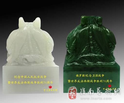 《中俄大阅兵双龙宝玺》由国家级玉雕大师袁广如、袁霖选用至为奢华名贵的和田玉亲自设计创作而成,总重约0.8公斤。每尊规格为5×5×7cm,寓意九五之尊无上地位,两方徽宝玺钮均雕刻一条威严盘龙,口吐祥瑞,象征风调雨顺,国泰民安。