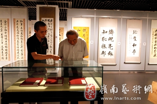著名书画家、全国政协委员、中国人民大学艺术学院创院院长徐庆平教授在策展人、国学典籍馆馆长宋双江的陪同下观看展览