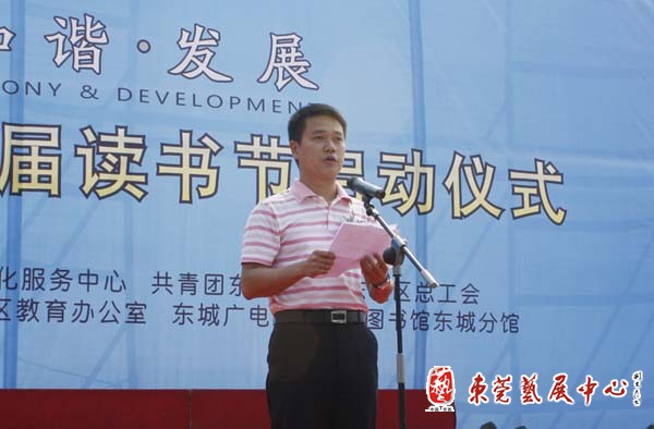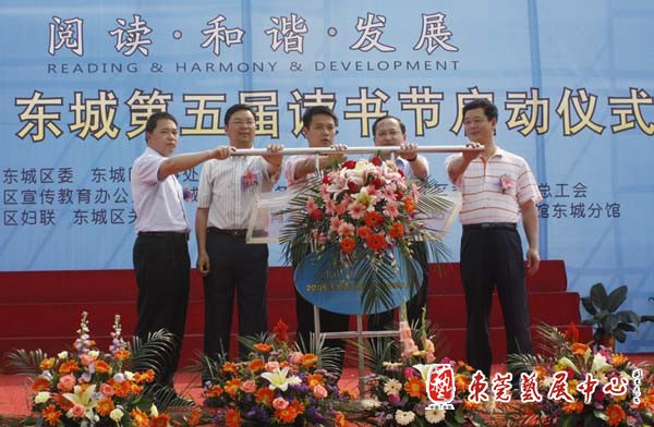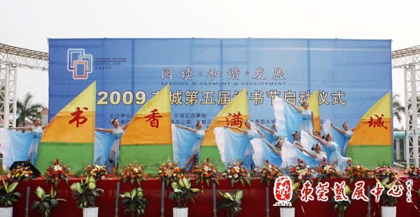 4月28日下午,东城文化广场彩旗飘扬,人头攒动。由中共东城区委、东城区办事处主办的2009东城第五届读书节启动仪式在这里举行。东莞图书馆馆长李东来、中共东城区委委员徐建文、东城区文化服务中心常务副主任康健、东城区教育办公室常务副主任邓任涛、东莞图书馆辅导部主任卢毅锋、和来自各社区、机关、企业和学校的近千群众出席了启动活动。中共东城区委委员徐建文在仪式上讲话。他指出,东城历来就有崇尚读书的传统,历史上各种勤学苦读、励志进取的故事层出不穷。在区委、区办事处的关心支持下,我们又建立了自己的读书节,并且持续时间长,活动内容多,已经成为全区市民文化生活中不可或缺的组成部分。他相信,通过读书节,倡导良好的读书习惯,形成浓郁的读书氛围,一定能够为推进经济社会双转型,保持全国文明城市的光荣称号作出更大的贡献。花园小学教师罗文文代表各界读者作了发言。随后,市图书馆馆长李东来,东城区委委员徐建文等相关部门领导共同按下了启动按钮。东城区的小学、幼儿园师生表演了自己编排的文艺节目。会场上还举办了摄影展览,东莞各书店也在现场开展了图书推荐和展销活动。本届读书节的主题为“阅读·和谐·发展”,包括举行阅读、朗诵、征文比赛、作家签名赠书、学习家庭评选等共18项活动,历时达半年。