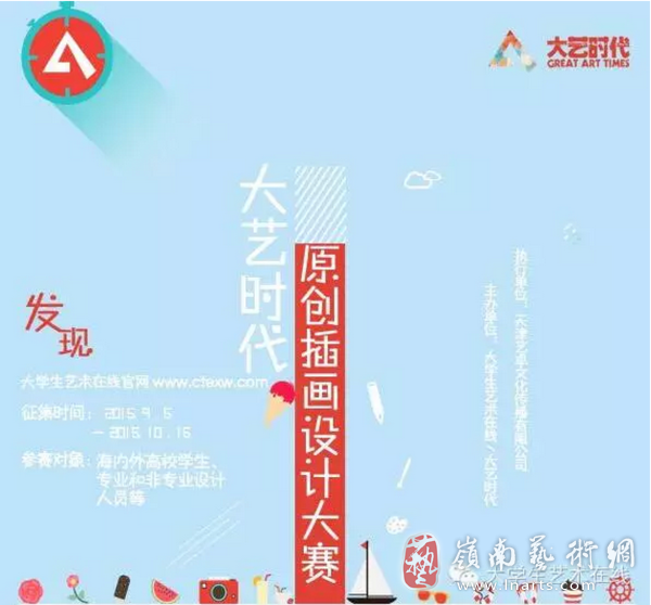 由大学生艺术在线发起,文化联盟、天津人民美术出版社、荣宝斋(呼和浩特市)、智慧山艺术中心、天津棉3创意街区·1921艺术空间、国家动漫产业园、映像江南美术馆、大艺时代美术馆(筹)、天津青年创业园、北京卓艺梵程国际文化传媒有限公司、西桔飞船俱乐部 、天津艺卓文化传播有限公司(排名不分先后)等支持媒体协办的2015年大艺时代全国原创插画设计大赛初选名单已正式公布。