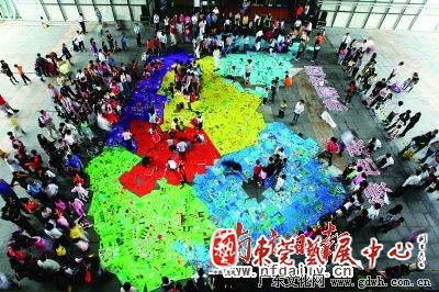 经过近一个小时的努力,240名孩子在市青少年活动中心老师的帮助下,用自己的图画、书法作品,在地面上拼出了一幅巨大的东莞地图。这张“地图”有城区、水乡片、山区片等不同区域,用不同的色块区别。